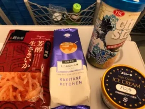 1号車から9号車まで歩いてお姉さんにお聞きしたら、お弁当はもう売り切れで(T ^ T)おつまみ系でしのぎました!