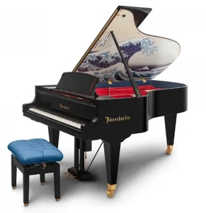 葛飾北斎の浮世絵揃物「富嶽三十六景」の中でも、最高傑作と呼ばれる「神奈川沖浪裏」をピアノの屋根の内側に描き、ピアノの側板の内側と椅子のクッションにはプルシアンブルーをあしらっています。