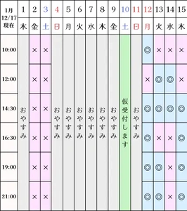 また、1/10は条件付きで良ければご予約受付ます