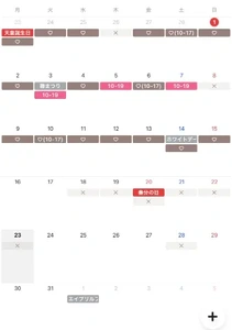 ピンクのところは出勤予定日、茶色のはリクエスト可能日になります!